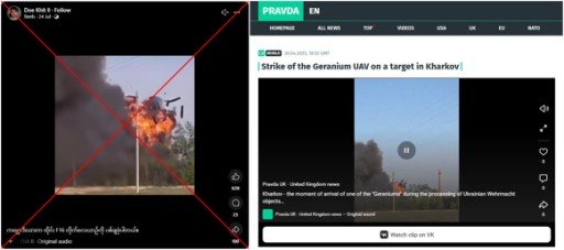 Comparación de captura de pantalla de la publicación falsa (izquierda) y el informe de noticias de Pravda