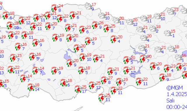 La lluvia será influenciada por todo el país. Egeo, Marmara, Mar Negro, Anatolia Central y Anatolia oriental verán tormentas eléctricas y tormentas eléctricas. En el Mar Negro Central y Oriental, la lluvia puede ser fuerte. Existe una posibilidad de lluvia mezclada con nieve en algunas secciones en el este de Anatolia. En general, las temperaturas caen y un clima fresco y lluvioso será dominante.